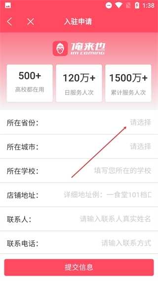 4、进入信息填写页面后,按顺序选择所属省份与城市,接着填写学校、店铺地址等相关信息,之后点击【提交信息】按钮,即可完成入驻申请流程。