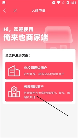 3、进入入驻申请页面后,挑选对应的注册类型(例如“校园周边商户”),接着进入信息填写界面。