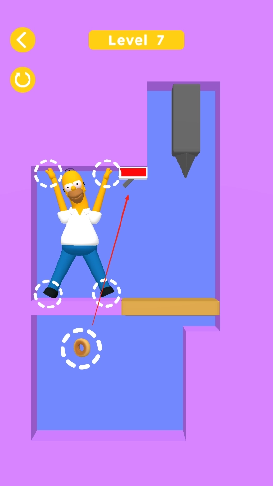 移动辛普森的手去触碰开关,使上方的尖刺落下砸破木板,这样辛普森就能通过并吃到甜甜圈了。