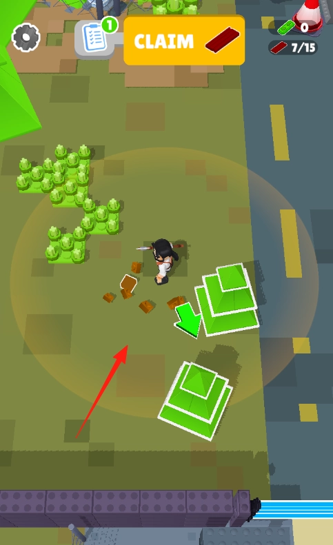 按照箭头指示前往绿色区域,角色需使用手中的武器砍伐树木,收集木材后任务栏会更新进度。