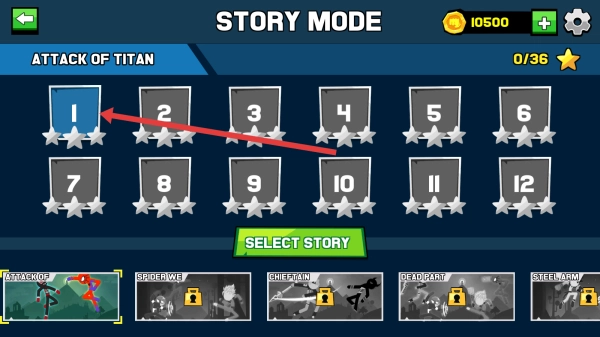 在STICKMAN-FIGHT-BATTLE-ROYALE的主界面中,点击右侧的Adventure选项,即可进入STORY-MODE的关卡选择界面,为挑战剧情关卡做好准备。