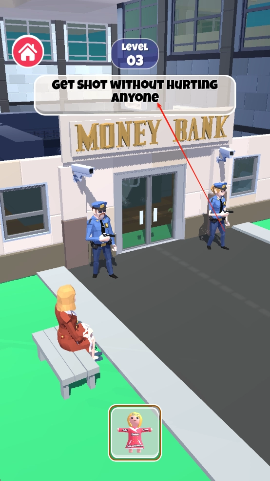 这一关的目标是消灭英雄,我们需要点击玩偶的左下角位置,这样当英雄冲过马路时就会有汽车撞向他,从而达成任务要求。