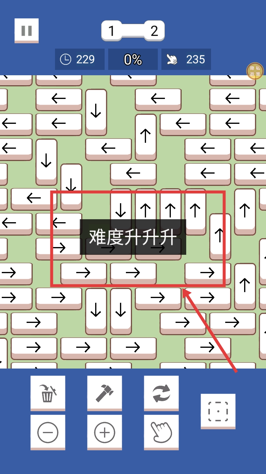 在【难度升升升】关卡中,需要规划方块的移动顺序,建议优先处理箭头方向便于操作的方块。