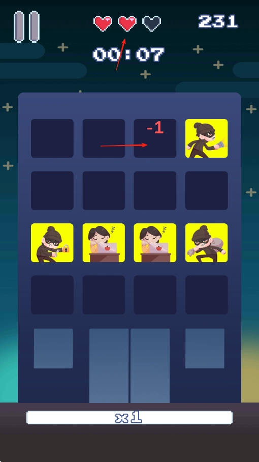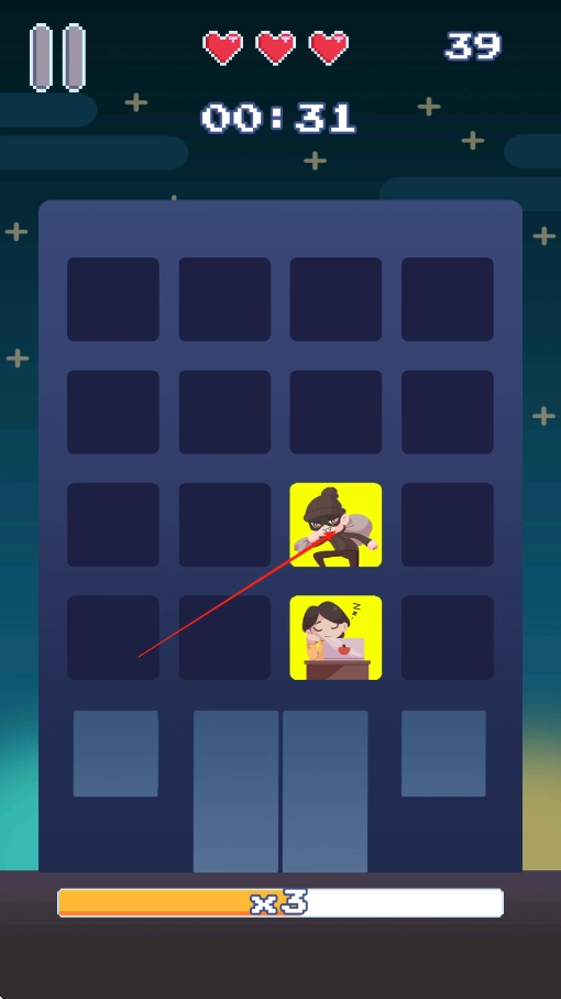 游戏启动后,会有一栋大楼出现在画面中,楼体上分布着若干扇窗户。游戏过程中,坏人会从任意一扇窗户里随机冒出来,这时你只要轻轻点击对应的那扇窗户,就能把他抓住了。