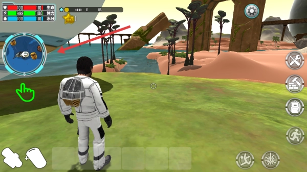 根据左上角小地图的提示,朝着标记的方向行进,穿过草地和水域时,注意观察场景中的资源以及隐藏的互动区域。