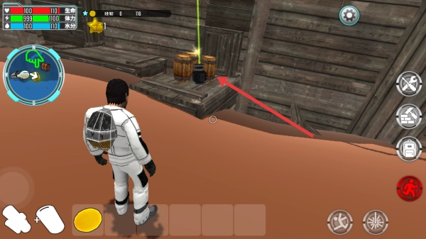 抵达目标建筑后,靠近木桶旁的发光物品,点击进行互动来获取道具或线索,以此推进生存和解谜任务的进度。