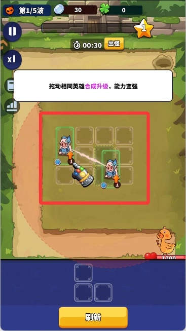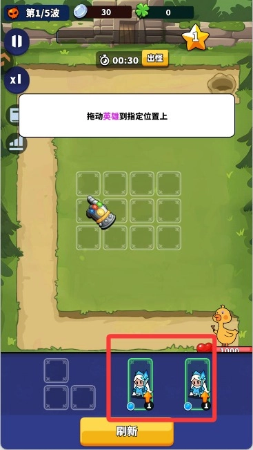 游戏开始时选择英雄和图腾神鸡,依据敌方怪物的属性特点,科学规划英雄的站位并部署防御塔,保证每一轮进攻的怪物都能被准确击退。