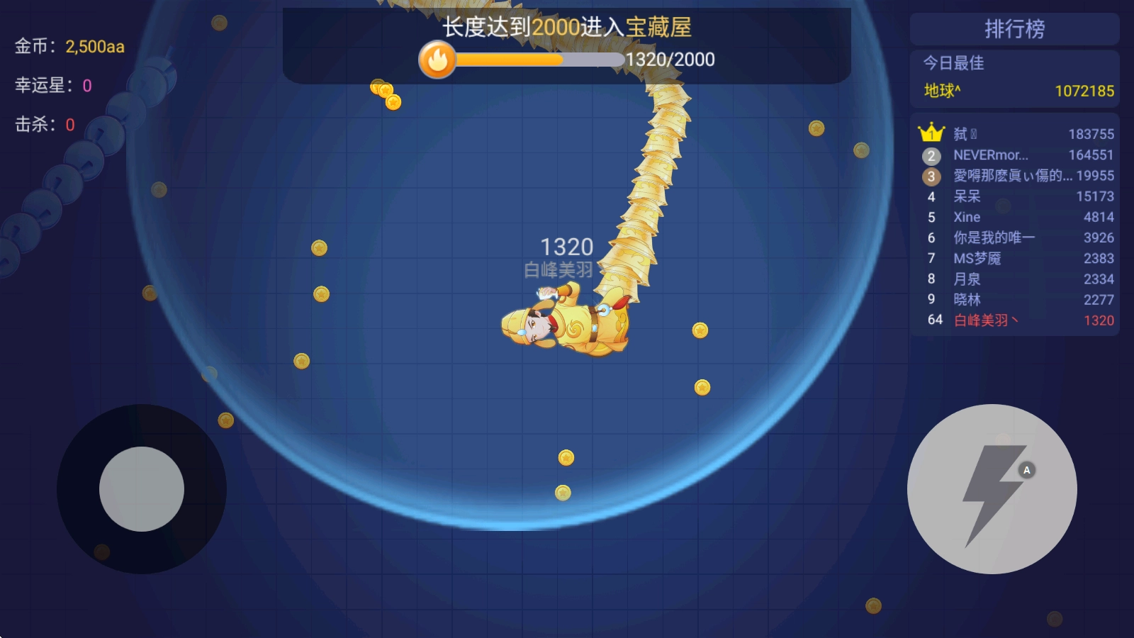 通过虚拟摇杆(或滑动屏幕)调整蛇头朝向