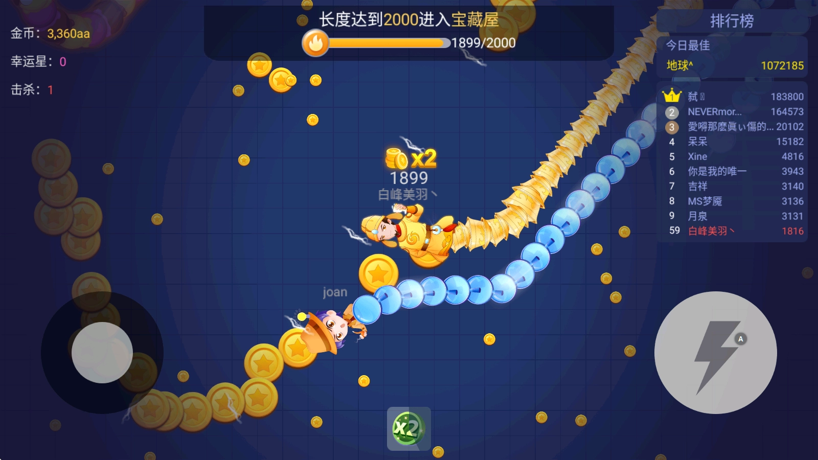 虚拟摇杆控制蛇头移动,身体会跟随轨迹生长。 吃豆豆变长,用身体围堵其他玩家使其撞上你。 头部碰撞会死亡,学会"画地为牢"和"金蝉脱壳"技巧。