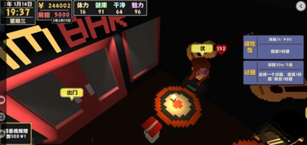 第四种方法是,点击游戏页面里的“出门”选项,然后在地点中选择酒吧,这样就能前往酒吧做兼职了,每次打工能挣到180元。