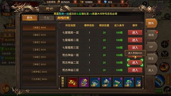 玩家能在野外地图开启挂机挑战,系统会自动进行战斗,这样就能解放双手,轻松实现升级提升;此外还有各类野外BOSS与个人BOSS可供挑战,通过挑战可以获取丰富的装备资源。