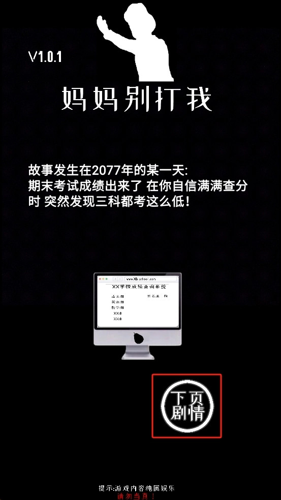 进入作品后,可点击右侧规则板了解基础操作指引,再点击下页剧情按钮,跟随流程开启由考试成绩引发的互动故事。