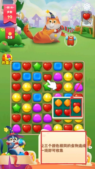 按照提示让三颗相同颜色的糖果连成一条直线,就能完成消除,进而推进关卡的进度。