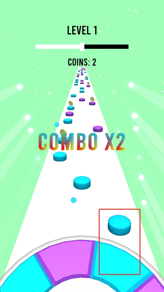 游玩时留意前方圆盘的颜色,点击对应颜色的区域来吸附圆盘,保持连续连击的效果,同时拾取金币,推动关卡不断前进。