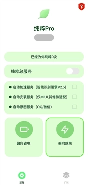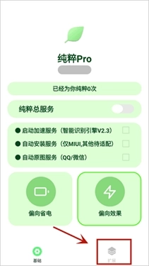 4、返回主界面,打开纯粹总服务的开关,同时勾选能够自动跳过广告的“启动加速服务”选项。