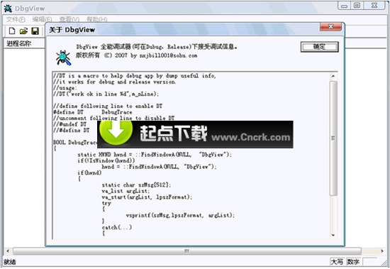 DbgView调试信息查看器 V1.0 绿色免费版 这是一款软件开发者常用的软件,往往一款软件在Debug下调试好了,可是在Release下可能还存在Bug,如何才能输出调试信息呢,全能调试器是解决您的问题的好帮助。全能调试器不仅仅能作为调试信息输出,而且可以作为一个信息输出软件,监视您的软件运行,欢迎您合作深度开发和提出宝贵意见
