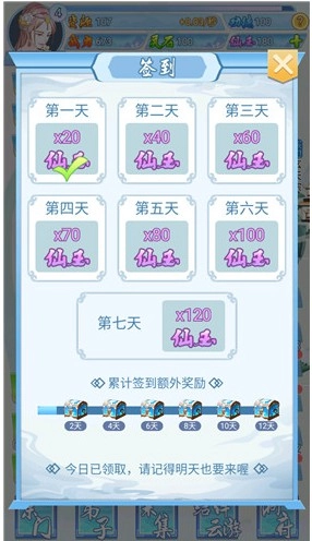 首先是签到奖励,这是平民玩家获取仙玉的重要方式,玩家签到时能得到一定数量的仙玉,签到奖励通常七天重置一次,大家记得每天都要签到。