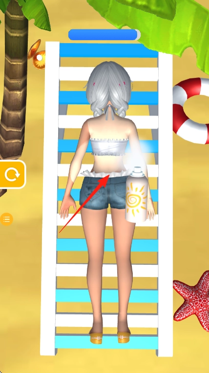 进入沙滩躺椅的场景后,跟着箭头的指引,给角色换上上衣、短裤这类服饰,打造出时尚的造型。