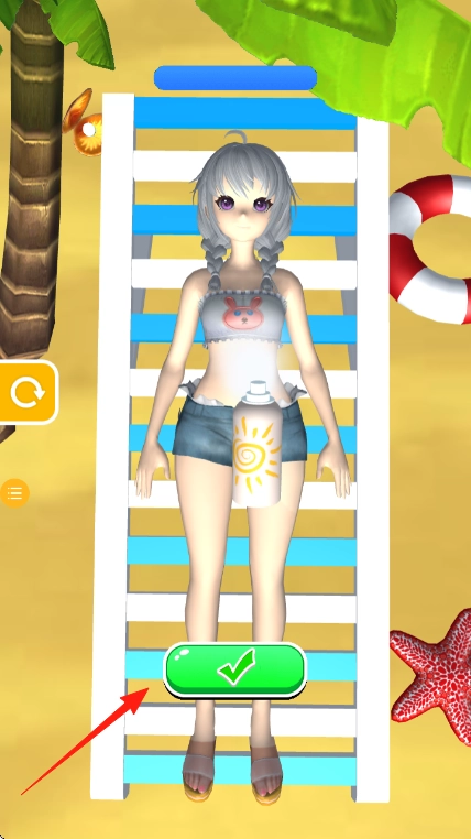 换装完成后,点击绿色对勾按钮确认装扮,就能完成这次沙滩时尚挑战,进而继续解锁新的道具。