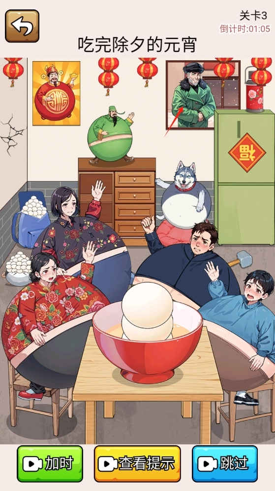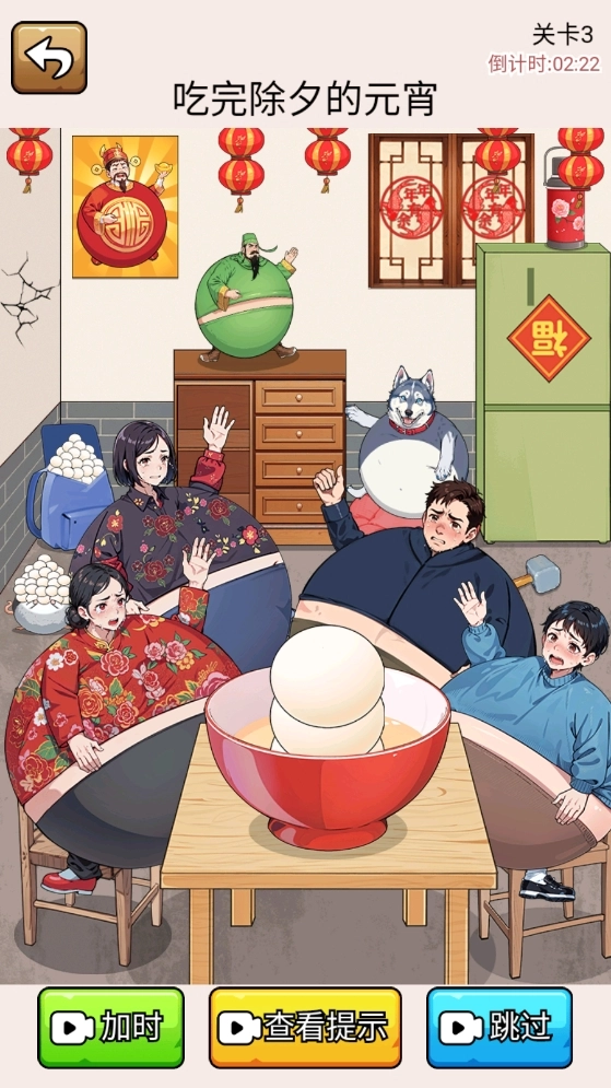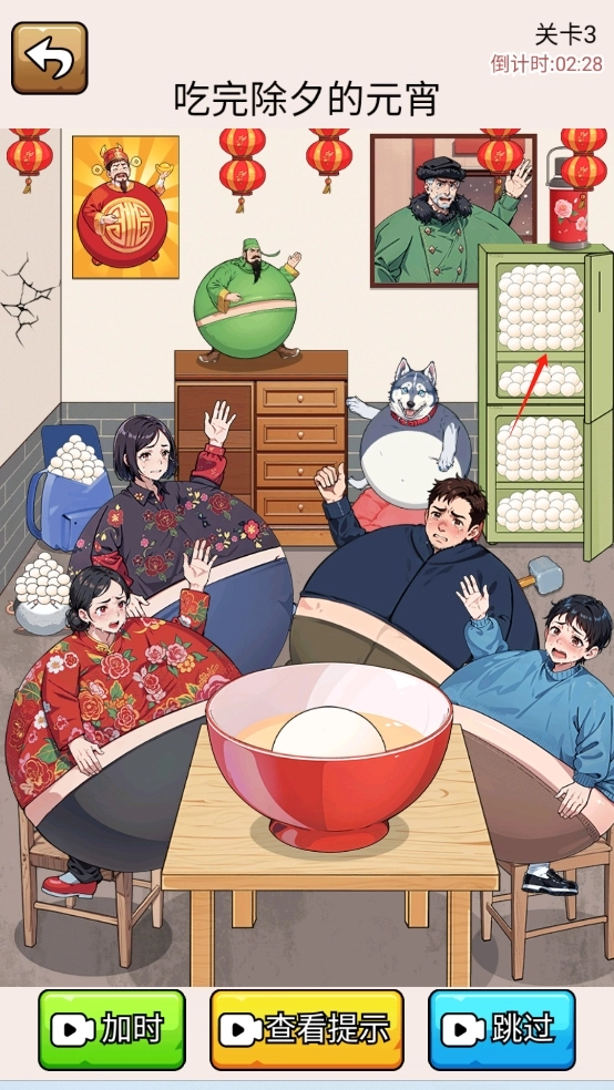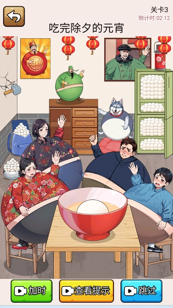 游戏任务是在限定时间内吃完所有元宵,首先我们可以点击手机,让妈妈分一些元宵给邻居(主要是因为后面如果吃撑了,妈妈这个角色就拿不动手机了)。