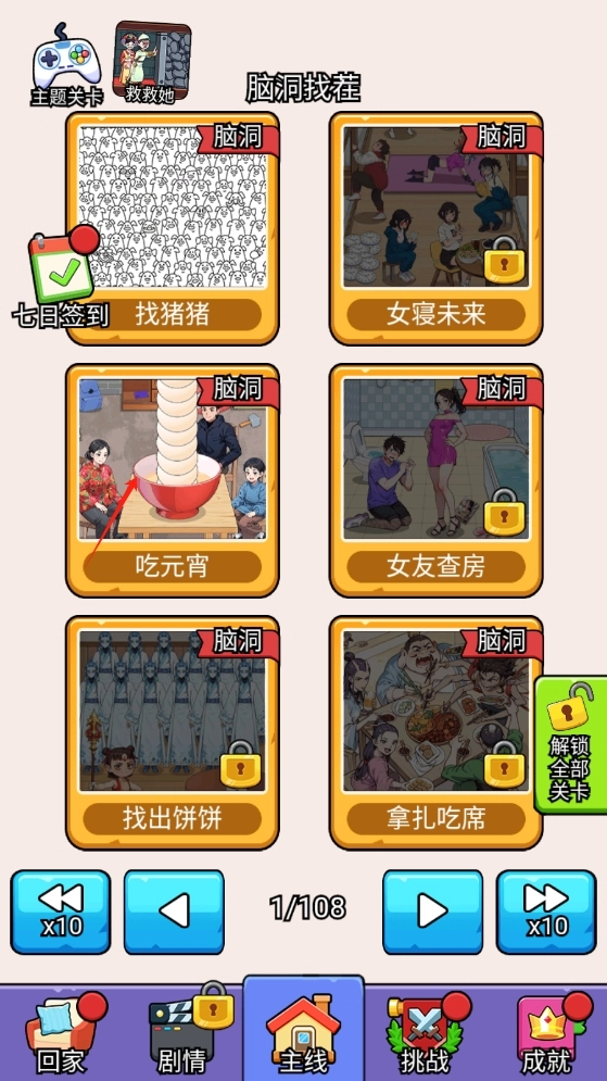 游戏主界面设有多个可供玩家自由选择的关卡,每个关卡都具备独特的玩法机制。我们以吃元宵关卡为例进行说明,后续关卡则需通过完成当前关卡才能解锁开启。