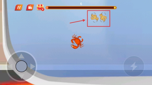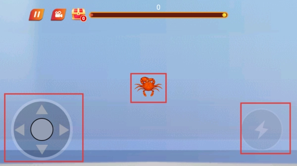 进入游戏后,可借助左下角的方向摇杆操控螃蟹移动,右下角的闪电按钮或许是用来实现加速或释放技能的。