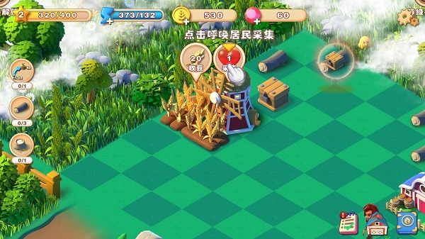 累计合成能够建造出对应的加工建筑,点击采集提示按钮可以引导居民前往田地或物品处获取特殊物品。