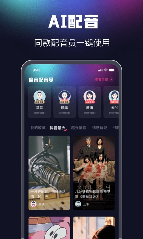 魔音是一款功能多样又充满趣味的配音应用,面向配音爱好者与专业人士打造。不管是刚入门的新手还是经验丰富的用户,都能借助这款应用快速掌握,感受配音的快乐。应用了大量素材模板,覆盖广告、有声读物、英语学习等诸多领域,用户可依据自身需求灵活挑选和运用。而且,魔音还提供个性化配音创作功能,助力用户制作出专属的声音作品。不管是用于学习、娱乐或是商业场景,魔音都能适配您的需求。赶紧来体验,开启您的配音征程吧!