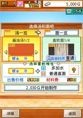 当相性良好时,制作面条的过程中会附加属性加成。初始提供的汤底分为酱油和味噌两类,而面条则依据形状(直形与弯形)、粗细程度以及加水比例来进行区分。