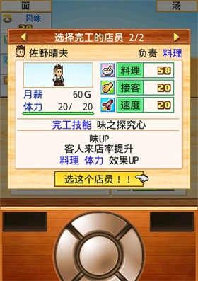 完成之后会询问你安排哪位雇员进行最后一步操作,要仔细查看自己拉面的各项属性(注意对话框可能会遮挡),思考需要补充提升哪一项属性,再找到对应属性的店员来确认。通常情况下,店员的属性越强,拉面相应属性的提升幅度就越大。