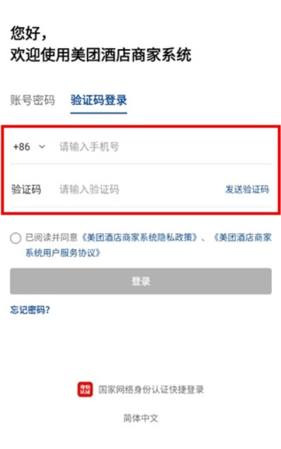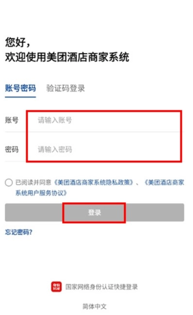 启动美团酒店商家端应用,进入登录页面后,选择密码登录模式,填写对应的账号信息与密码,再点击登录按钮完成操作。