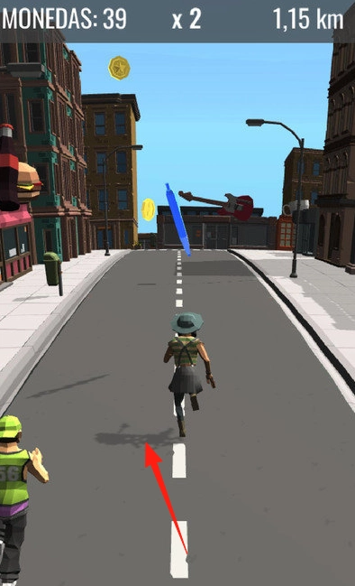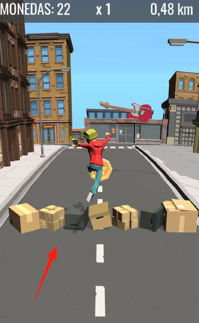 收集进度相关的金币(MONEDAS:22→39),展示距离(0,48km→1,15km)、倍数(x1→x2),避开障碍物(箱子、路障)。