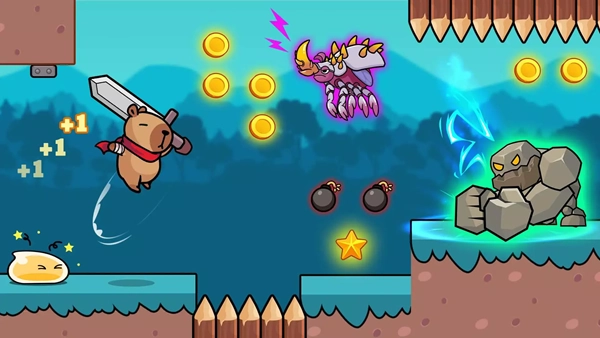 《卡皮巴拉世界超级跑酷》是一款融合冒险、解谜与战斗元素的2D平台游戏。玩家将化身勇敢又可爱的水豚,开启一段满是刺激与惊喜的冒险征程。游戏核心玩法聚焦于操控水豚完成移动、跳跃、冲刺与战斗动作,玩家需借助解谜与战斗环节逐步推进任务,最终守护世界和平。