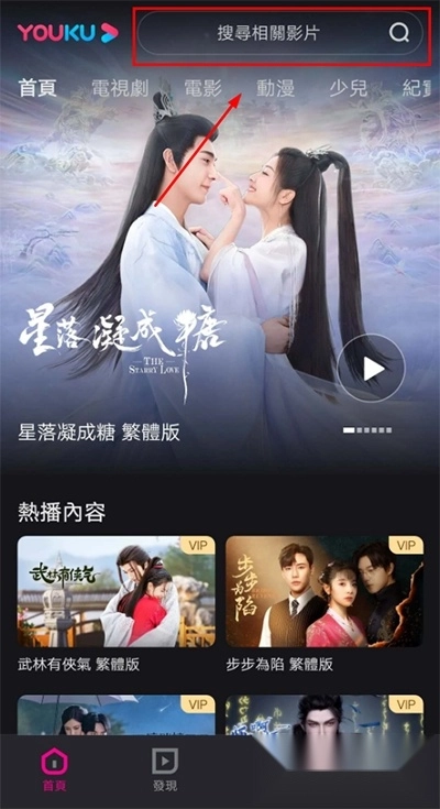 启动优酷视频的海外版本后,在应用主界面的搜索区域输入你感兴趣的影视内容进行查找。
