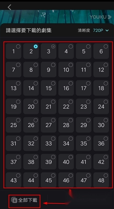 你可以挑选想缓存的单集内容,也能直接点击【全选】按钮,把这部剧的所有视频都纳入缓存列表。