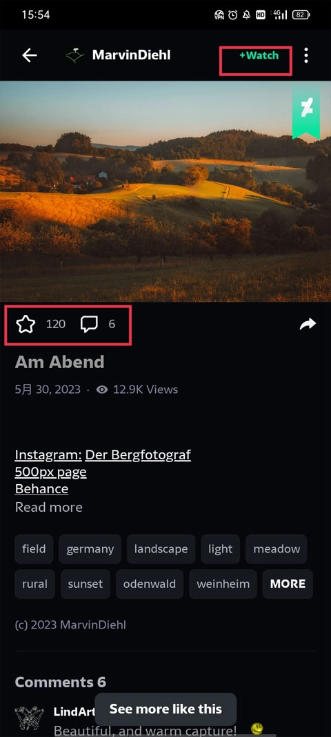 完成登录操作后,用户能够对自己钟爱的绘画、素描类作品进行收藏与评论。此外,点击界面右上角的“+Watch”按钮,还能实现分类管理功能,从而更高效地对图片资源进行整理归纳。