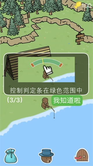 在池塘边,玩家操控小熊拿起鱼竿钓鱼,当成功钓上鱼时,需要长按屏幕来耗尽小鱼的体力。