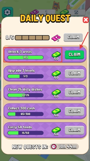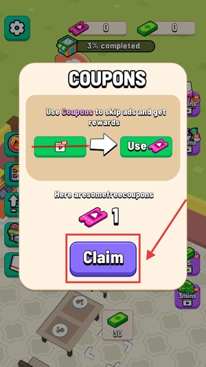 完成每日任务后点击CLAIM按钮领取奖励,合理使用优惠券跳过广告,节省时间专注经营。