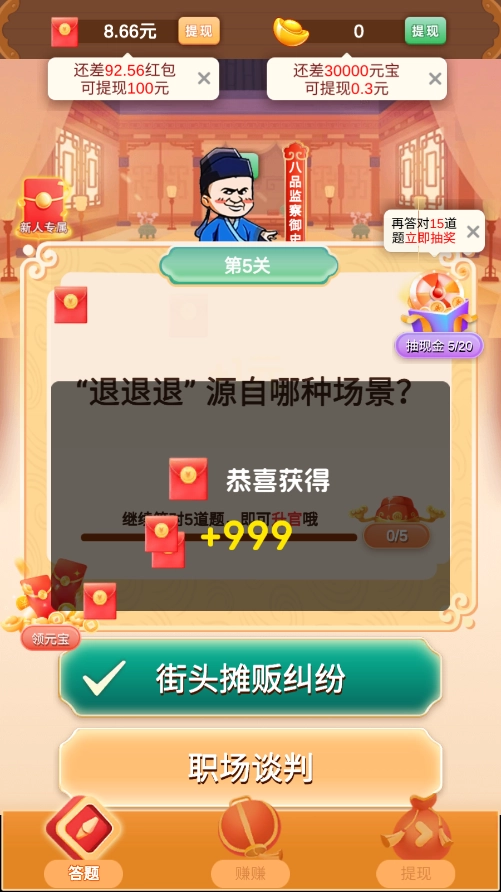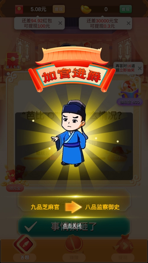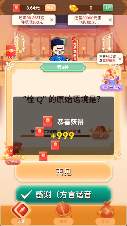 玩家需要一关一关地回答问题,每一关的难度会慢慢增加,只要答对题目就能进入下一关,要是失败了就得重新挑战这一关,或者用道具让自己复活继续闯关。