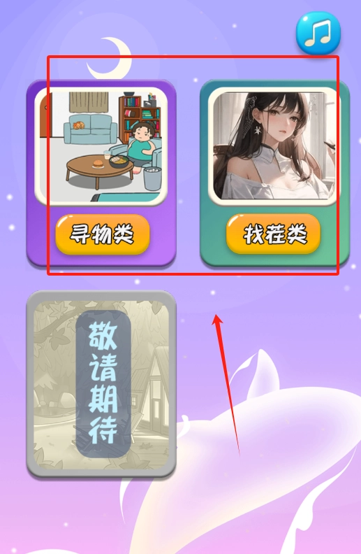 点击上方左右两张彩色卡片来挑选游戏,紫色卡片对应寻物类游戏,绿色卡片对应找茬类游戏;下方的灰色卡片则需要等待更新;另外,右键点击可以实现暂停操作。