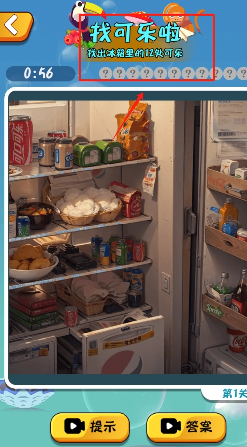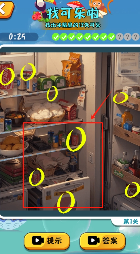 抓紧时间找出剩下的3罐可乐,用红框黄圈标注线索,尽快点击提示或答案完成关卡,右键可重新开始。