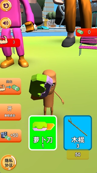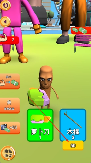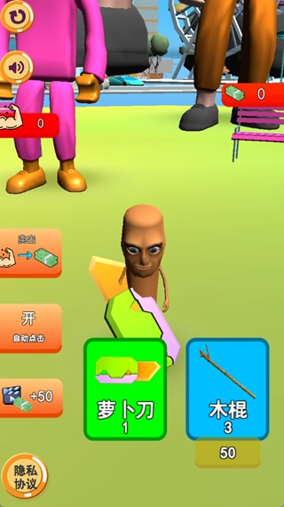 前期选择木棍,实惠又实用,通过持续操作来积攒基础能力;碰到实力强劲的对手时,就换成萝卜刀,借助它的短时间高额输出,来扭转不利的局面。