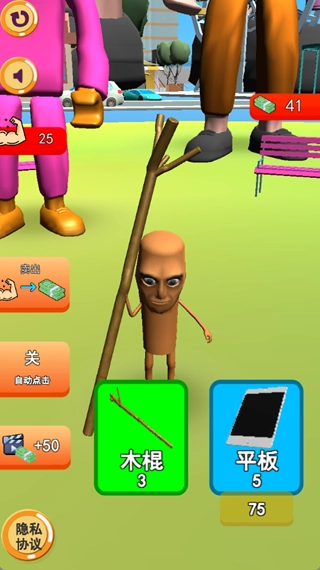 全程用木棍,攒力量值升肌肉基础等级,别浪费稀有道具,把资源留给后期对决。