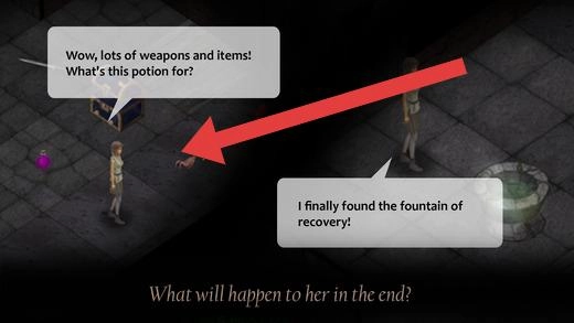 进入“Surviving in the Dark”场景后,探索周边区域,与宝箱和恢复之泉进行互动,了解武器、道具以及药水的用途。
