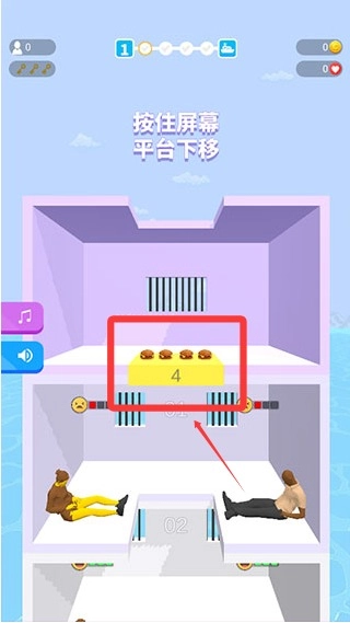 进入游戏后,你需要操控黄色食物台进行上下滑动,同时留意每一层囚犯头顶显示的颜色状态,通过这些颜色来判断他们各自的饥饿等级,进而决定是否对其进行投喂。