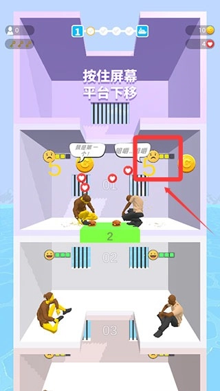 长按屏幕可使平台下移,松开后平台停止移动;需在楼层不断变化的过程中精准把控操作节奏,防止出现资源浪费或投喂不及时的情况。