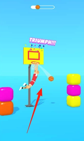 在扣篮挑战中操控红衣篮球角色,于蓝色场景里跳跃穿越彩块障碍,成功完成扣篮后,屏幕会显示“TRIUMPH!!!”来进行庆祝。