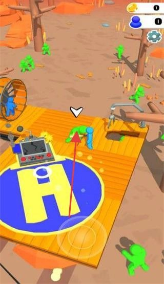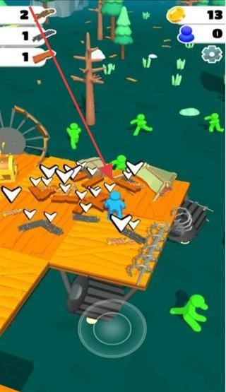 控制蓝色角色,前往带有白色箭头标识的木板区域,拾取武器或道具来提升战斗能力。
