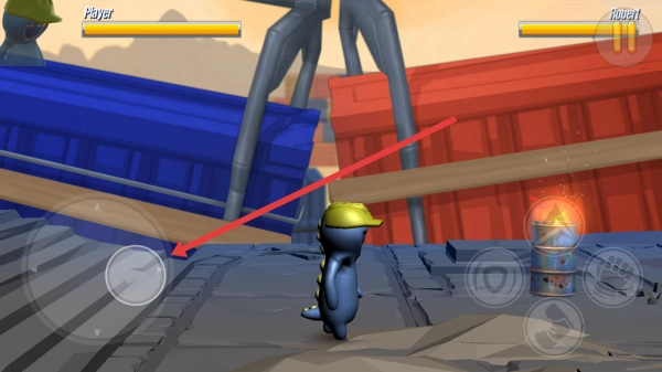 战斗时,通过左侧虚拟摇杆(红箭头所指位置)操控角色移动,避开敌人的攻击,把握合适的机会发起进攻,从而战胜对手。