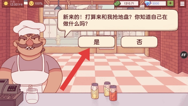 这段文本呈现了角色间的对话场景,包含的实体信息涉及名称类内容、角色所说的台词,还有“是”与“否”的选择按钮,展现出经营过程里或许会碰到的竞争互动类情节。